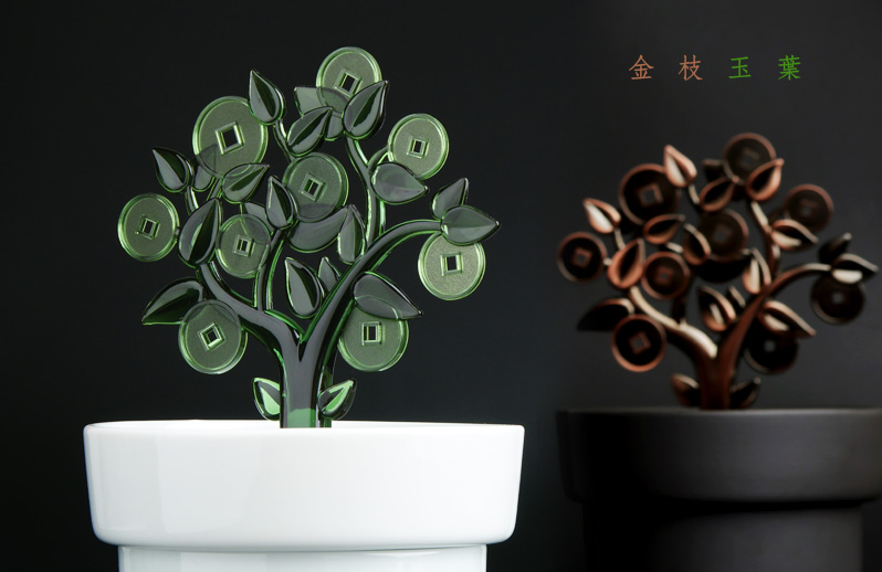 | 枝葉間綴以中國傳統古銅錢,象徵著結實纍纍的金桔樹,光線照射下,古意綠與現代銀各閃耀著不同韻味的光澤,和諧平穩的氛圍流洩在周遭圍繞著,在視覺與知覺上同步滿足喜愛中式儒雅的你與沈醉金屬質感的你。 |