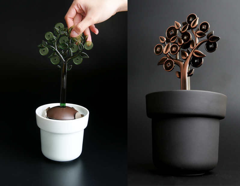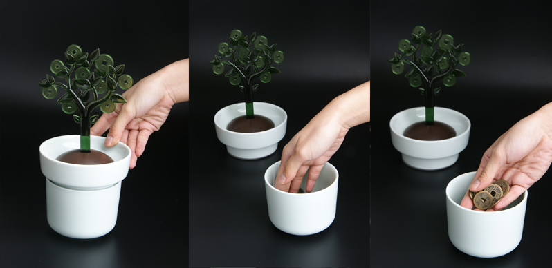| 哐啷、哐啷,拉起金桔樹的樹枝,安置在樹下的錢幣喧嘩而下,耳邊響起銀鈴般的響聲,正所謂滾石不生苔,流水財運來,不停流轉的零錢才能招財進寶。在五感的享受之下,存錢的動力似乎就在聲響與動作中,一點一點被激勵了!除此之外,隨著底盆零錢的增加,金桔樹也一吋、一吋地成長,讓你的財富成長看得見,也看見你聚沙成塔的堅強毅力。 |